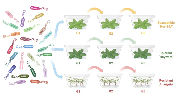 Host specificity of a plant pathogen is defined by its effector complement. However, it remains unclear whether the full complement is required for pathogenicity. Pseudomonas syringae pv. actinidiae (Psa) is an emerging model pathogen of kiwifruit with over 30 functional effectors, providing a unique opportunity to understand how host-mediated selection shapes pathogen evolution. The majority of Psaโs effectors previously appeared non-essential in single knockout contexts. Why, then, does Psa maintain such a large repertoire? We sought to examine effector requirements, redundancies, and repertoire refinement across host genotypes through a mutated effector-leveraging evolution experiment (MELEE), serially passaging competitive populations of effector knockout strains. Competition suggests that all effectors are collectively required for successful virulence, demonstrated by the dominance of wild-type. Host-specific effector requirements identified may further explain the maintenance of this large effector repertoire, providing important insights into the dynamics of effector redundancy following incursions.