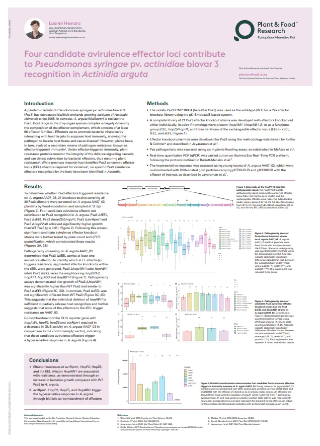 Four candidate avirulence effectors contribute to Psa3 recognition in Actinidia argutaJul 1, 2021 ยท 0 min readGo to Project Site PDFLast updated on Jul 1, 2021Poster AuthorsLauren HemaraPostdoctoral FellowLauren Hemara is a Postdoctoral Fellow at the University of Toronto Scarborough. ← Effector knockout competition reveals individually redundant effectors are collectively required for successful virulence Jul 1, 2023