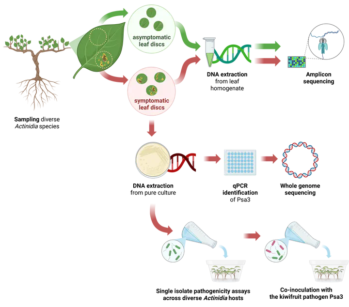 In 2010, a Pseudomonas syringae pv. actinidiae biovar 3 (Psa3) incursion into New Zealand kiwifruit orchards devastated susceptible Actinidia chinensis cultivars. In contrast, many Actinidia species maintained in germplasm collections were resistant to Psa3 and showed limited symptoms. Recent genome biosurveillance revealed the emergence of widespread leaf spot symptoms in Psa3-resistant Actinidia germplasm. Surprisingly, few Psa3 isolates were recovered from symptomatic tissues, despite the frequent isolation of phenotypical Pseudomonas isolates on selective agar. Despite the poor recovery of Psa3 isolates, Psa3 was found in all symptomatic leaf tissue through qPCR and metabarcoding analysis. Metabarcoding revealed stark differences in bacterial community composition from samples taken from lesion-carrying or lesion-free material from the same leaf. Host genotype also appeared to influence community composition but to a lesser extent. Whole genome sequencing of diverse Pseudomonas spp. isolates revealed that many belonged to the P. syringae species complex. Curiously, the kiwifruit-associated P. syringae pv. actinidifoliorum (Pfm), was never recovered, nor were any other phylogroup 1 pathovars. Pathogenicity and competitive assays revealed that while individually diverse Pseudomonas isolates were not more pathogenic than Pfm or Psa3 on resistant Actinidia hosts, they could interact with Psa to sometimes improve their growth, suggesting that these isolates may form pathogenic consortia in these disease-associated phyllosphere communities on typically Psa3-resistant hosts.